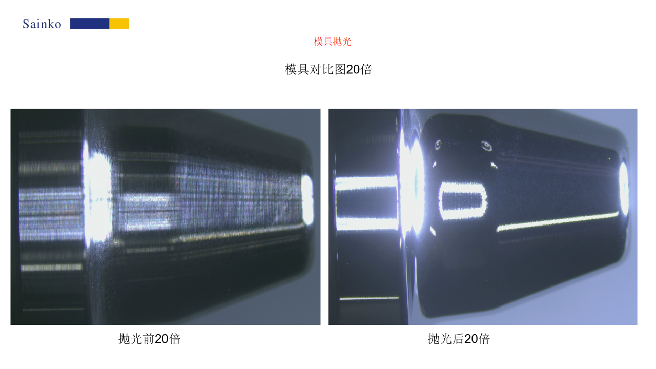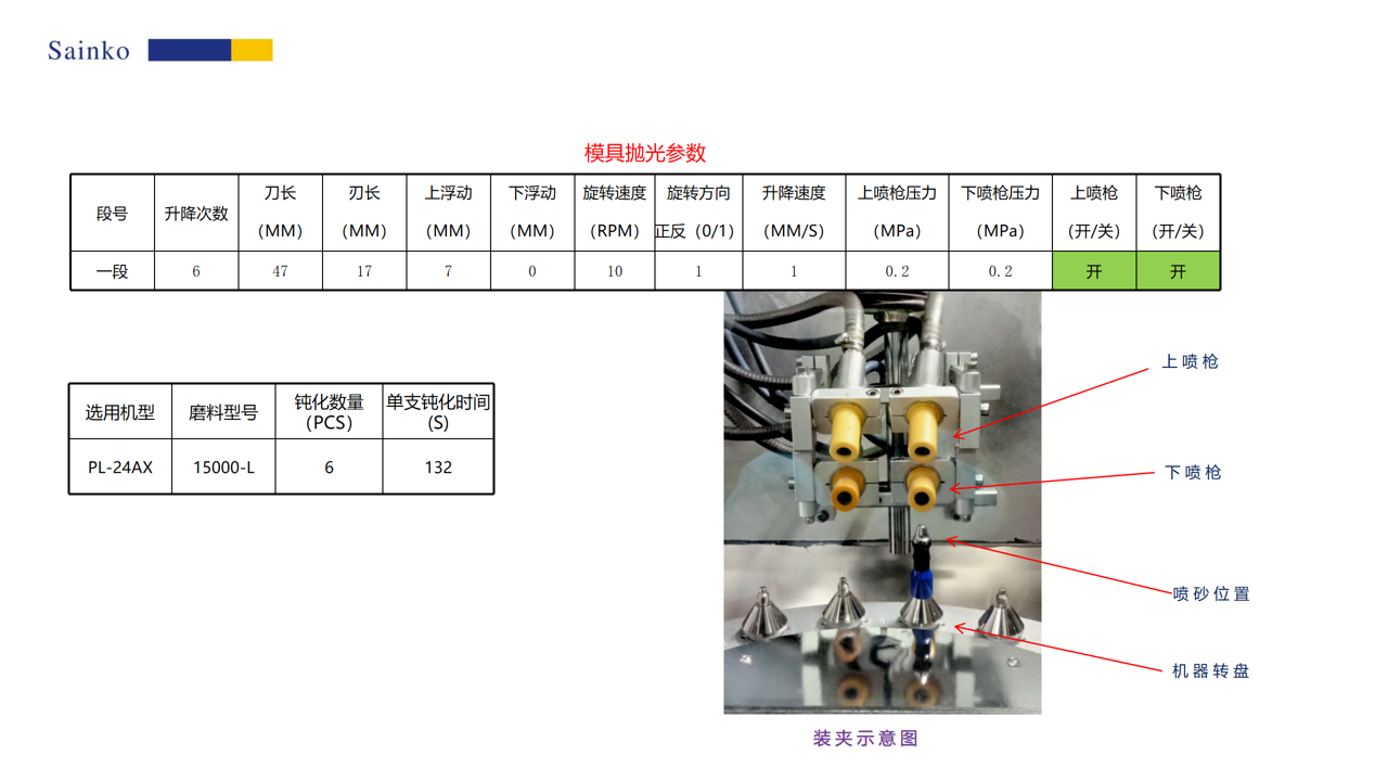 本次模具拋光針對(duì) 6 件模具開展,以基恩士為檢測(cè)設(shè)備,采用 PL-24AX 設(shè)備及 15000-L 磨料實(shí)施一段式工藝(升降次數(shù) 6 次、刀長(zhǎng) 47/17mm、上浮動(dòng) 7mm / 下浮動(dòng)0mm、旋轉(zhuǎn)速度 10RPM、升降速度 1mm/s、雙噴槍壓力 0.2MPa 開啟),單支鈍化時(shí)間 132 秒;拋光中通過(guò)工刀具夾套將模具固定于機(jī)器轉(zhuǎn)盤,噴砂位置對(duì)應(yīng)上下噴槍區(qū)域;效果上,拋光前模具表面有細(xì)微紋路、光澤度低,拋光后呈現(xiàn)鏡面效果,20 倍顯微觀測(cè)下,拋光前的加工紋理消失,表面平整光潔。
